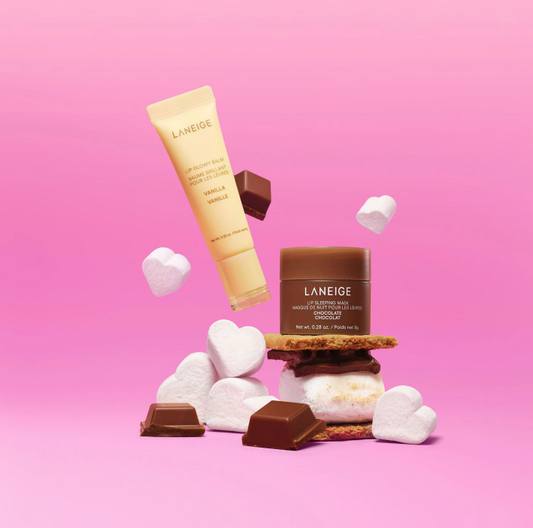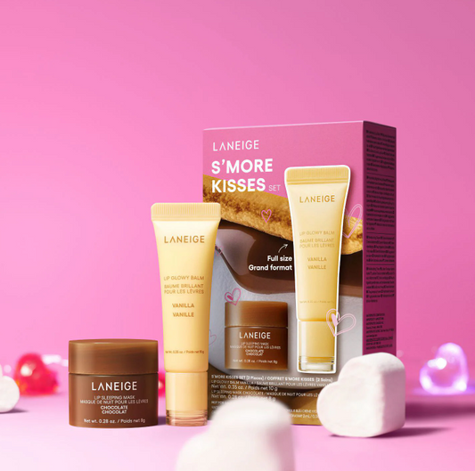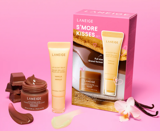 Setul S'MORE KISSES, Laneige contine: Balsam de buze Lip Glowy Balm Vanilla 10g si Masca de noapte pentru buze Lip Sleeping Mask Chocolate 8g.